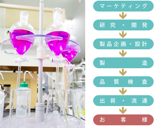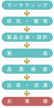 不断の研究開発とこれまで培ってきた技術と経験を活かし、お客様の立場に立って、お客様のニーズに合った製品開発を行って参ります。製品の企画設計の段階から安全性、環境に配慮し、製造、作業工程、設備保全、製品検査、保管、流通の各プロセスで品質管理に心掛け、安全で高品質の製品をお届けします。 又、お客様と流通の方々からの声に関心を払い、継続して品質の維持・向上に努めます。